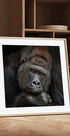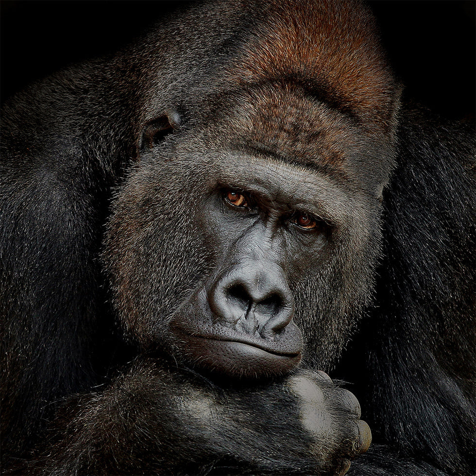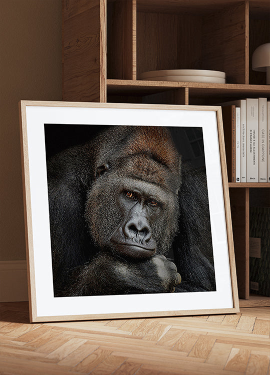 Intensywny, stonowany plakat portretowy majestatycznego goryla srebrnogrzbietego uchwycony w chwili cichej kontemplacji. Głębokie, mądre oczy spotykają się z twoimi i jednocześnie tworzą obecność, wrażliwość i siłę. Cienie podkreślają charakterystyczne cechy i nadają motywowi ponadczasowy, rzeźbiarski spokój. Autor: Antje Wenner-Braun. Tytuł to JEDNA CHWILA W KONTAKCIE.