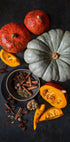 Rustykalna jesienna martwa natura z dynią, laskami cynamonu, gałką muszkatołową, kardamonem i anyżem gwiazdkowatym. Ta ciepła i przytulna kompozycja oddaje esencję jesiennych zbiorów i smaków pory roku, idealna do kuchni i świątecznych dekoracji bożonarodzeniowych.