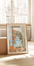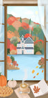 Przytulna jesienna scena widziana z okna, z uroczą chatką nad jeziorem otoczoną kolorowymi jesiennymi liśćmi. Ciepłe, sezonowe detale ilustracji, w tym dynia, ciasto, kawa i świece, sprawiają, że idealnie nadaje się ona do wnętrz w stylu wiejskim, rustykalnym i inspirowanym przytulnością.