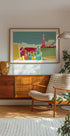„Amsterdam Jordaan Westerkerk” Remko Heemskerka oddaje urok dzielnicy Jordaan: kolorowe domy szeregowe, ostre fasady i kultowy Westerkerk wznoszący się nad dachami miasta. Graficzna, zabawna kompozycja w jasnych kolorach, która destyluje Amsterdam w czystą poezję metropolitalną. Idealny jako element przyciągający wzrok w domu.