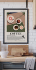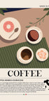 Plakat inspirowany kuchnią włoską przedstawiający zarys filiżanek kawy, deseru i kostek cukru na stole. Plakat podkreśla historię i proces produkcji kawy, ze szczególnym uwzględnieniem włoskiej tradycji espresso. Idealny dla kawiarni, miłośników kawy i miłośników włoskiej kultury.