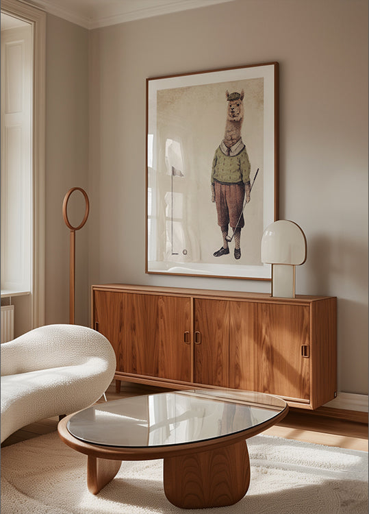 Stylowy i fantazyjny hołd dla zieleni: Alpaca Golf Club Mike'a Koubou przedstawia elegancką alpakę w klasycznym stroju golfowym, złapaną w połowie zamachu na spokojnym polu golfowym. Kolory retro i subtelne pastele tworzą atmosferę vintage pełną humoru i uroku — idealne do sportowych ścian i zabawnych dekoracji. Przyciąga wzrok, wywołując uśmiech na twarzy gości.