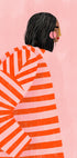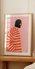 Ta grafika ma minimalistyczny design, który podkreśla kobietę w stroju w czerwono-białe paski na delikatnym różowym tle. Nowoczesna estetyka i odważne użycie koloru tworzą charakterystyczną ekspresję wizualną, idealną dla miłośników sztuki współczesnej.