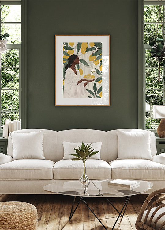 Stylowe i nowoczesne dzieło sztuki przedstawiające elegancką kobietę w gaju cytrynowym, trzymającą misę świeżych cytryn. Czyste, żółte owoce pięknie kontrastują z soczystą zielenią liści, tworząc spokojną i elegancką kompozycję do domu lub biura.
