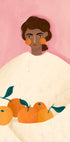 Ta grafika przedstawia stylizowany portret osoby trzymającej pomarańcze na pastelowym różowym tle. Ciepłe odcienie i nowoczesny design podkreślają takie motywy jak natura i prostota oraz łączą estetykę zarówno sztuki współczesnej, jak i ilustracji.