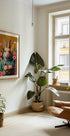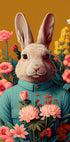 Pomysłowy i uroczy plakat z królikiem w turkusowej kurtce w otoczeniu kwitnących kwiatów. Zabawna kompozycja łączy w sobie ilustrację vintage z surrealistyczną fantazją, idealna do pokoju dziecięcego, pokoju zabaw lub dla każdego, kto kocha humorystyczne portrety zwierząt.