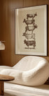 Humorystyczna i surrealistyczna grafika w stylu vintage przedstawiająca stos krów, każda nosząca inny kapelusz. Zabawna ilustracja, która łączy wiejską nostalgię z ironicznym humorem – idealna do wystroju wiejskiego domu lub eklektycznych kolekcji dzieł sztuki.