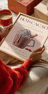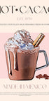 Parująca filiżanka kremowego, gorącego kakao zajmuje centralne miejsce na ilustracji inspirowanej stylem retro autorstwa Nazmy Khokhar. Ciepłe odcienie brązu, kremowe refleksy i delikatne różowe odcienie tworzą przytulną, kawiarnianą atmosferę w stylu vintage. Elegancka typografia i subtelne nawiązanie do lat 50. XX wieku sugerują klasyczną estetykę plakatu kawiarnianego z nutą meksykańskiej tradycji kakao.