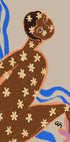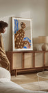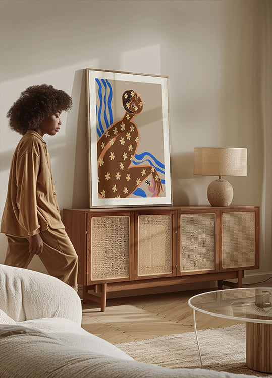 Żywa, figuratywna grafika przedstawiająca ludzką postać pokrytą kwitnącymi stokrotkami. Ziemiste odcienie sylwetki kontrastują z jasnoniebieskimi liniami, które dodają ruchu i energii. Wyjątkowa i wyrazista praca inspirowana roślinnością, łącząca w sobie kwiaty i ludzką ekspresję, idealna do nowoczesnych wnętrz.