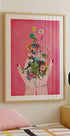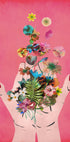 Żywa i nowoczesna grafika przedstawiająca dłonie uwalniające eksplozję kolorowych kwiatów i liści na różowym tle. Kwiatowy kolaż łączy naturę i kreatywność oraz symbolizuje wzrost, odnowę i piękno. Idealnie pasuje do nowoczesnych wnętrz z nutą botanicznego uroku.