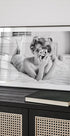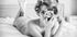 Stylowy czarno-biały plakat przedstawiający inspirowany stylem retro portret kobiety z lokami w stylu vintage, leżącej elegancko na łóżku, trzymającej klasyczny aparat. Łącząc zmysłowość, nostalgię i ekspresję artystyczną, fotografia celebruje kobiecą atrakcyjność i ponadczasowy urok.