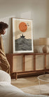 Minimalistyczna ilustracja samotnej postaci w małej łódce unoszącej się na falach czarnych pod jaskrawym pomarańczowym słońcem. Czyste linie i ciepłe odcienie tworzą spokojny, zamyślony nastrój – idealny element do nowoczesnych przestrzeni, które charakteryzują się spokojem i prostotą.