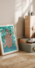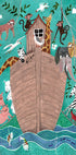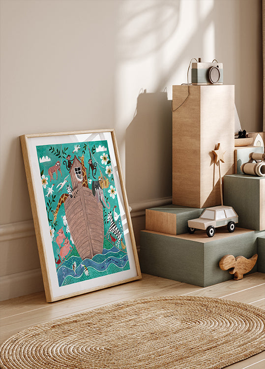 Zabawna i kolorowa ilustracja przedstawiająca Arkę Noego wypełnioną zwierzętami, takimi jak żyrafy, słonie, zebry, małpy i ptaki. To urocze dzieło sztuki, otoczone bujnymi kwiatami i żywą wodą, oddaje radość i wyobraźnię ukochanej historii biblijnej. Idealny do pokojów dziecięcych, żłobków lub dla każdego, kto kocha ilustracje zwierząt.