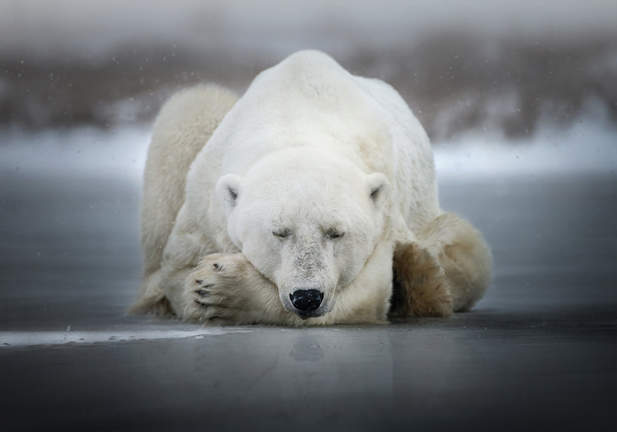 Spokojne zdjęcie natury przedstawiające niedźwiedzia polarnego odpoczywającego spokojnie na lodzie z zamkniętymi oczami w głębokim spoczynku. Kompozycja przywołuje takie tematy, jak uważność, duchowość i święte połączenie natury i ciszy. Silne przypomnienie zarówno siły, jak i wrażliwości natury.