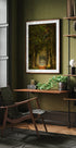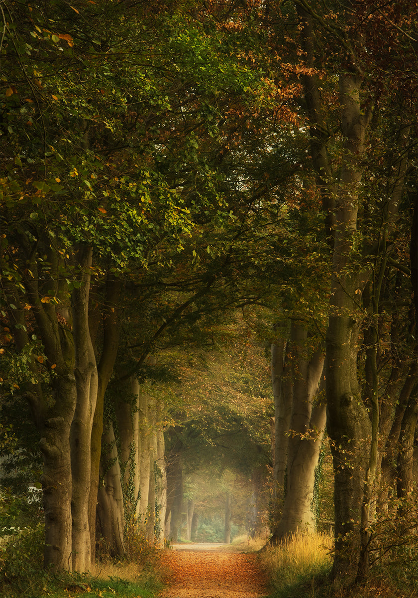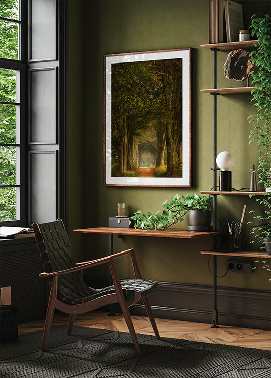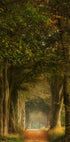Wymarzona leśna ścieżka pokryta jesiennymi liśćmi, otoczona wysokimi drzewami i miękkim złotym światłem. Ta grafika oddaje ciche piękno natury i przywołuje poczucie spokoju, refleksji i ponadczasowych podróży przez urokliwe lasy.