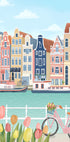 Kolorowa i urocza ilustracja miasta Amsterdam z jego kultowymi domami nad kanałem, rowerami, tulipanami i łodziami. Dzieło oddaje esencję holenderskiej kultury, z tętniącymi życiem fasadami, cichymi kanałami i romantyczną miejską atmosferą. Idealny dla podróżników i osób zainspirowanych europejskim urokiem.