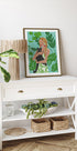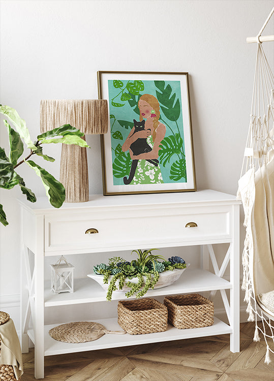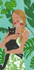 Żywa ilustracja przedstawiająca kobietę trzymającą czarnego kota, otoczoną bujnymi liśćmi monstery. Mocne kolory i tropikalna estetyka zapewniają ciepły, nowoczesny wyraz, idealny dla miłośników kotów i wnętrz botanicznych.