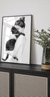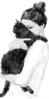Delikatna czarno-biała ilustracja w stylu akwareli przedstawiająca kobietę obejmującą kota. Ta wrażliwa grafika wyraża miłość, intymność i ponadczasową więź między człowiekiem a zwierzęciem, idealna do wnętrz minimalistycznych i inspirowanych zwierzętami.