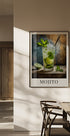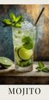 Żywa grafika przedstawiająca klasyczny koktajl mojito z liśćmi mięty, kawałkami limonki i słomkami w szklance wypełnionej lodem. Teksturowane tło podkreśla świeżą i orzeźwiającą atmosferę, idealną dla fanów sztuki picia i koktajli.