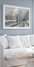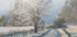 Ten spokojny zimowy krajobraz przedstawia mroźny poranek na cichej wiejskiej drodze, z pokrytym śniegiem drzewem świecącym w delikatnym pastelowym świetle. Stonowane odcienie i spokojna atmosfera przywołują ciszę, świeżość i ciche piękno poranka, tworząc kojącą grafikę dla ścian sezonowych i inspirowanych naturą.