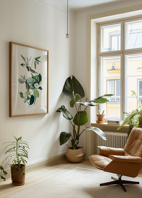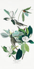 Sztuka botaniczna w stylu vintage z kwiatami magnolii i szczegółowymi przedstawieniami ptaków. Elegancka i misterna ilustracja natury, która podkreśla żywe liście w delikatnej kompozycji. Idealny dla miłośników klasycznych grafik botanicznych i sztuki historii naturalnej.