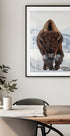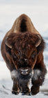 Imponujące zdjęcie natury przedstawiające żubra szarżującego przez śnieg. Ten dramatyczny obraz, z mroźnym oddechem i śniegiem na twarzy, oddaje surową siłę, wytrzymałość i majestatyczną obecność jednego z najbardziej kultowych zwierząt Ameryki Północnej.
