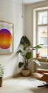 Nowoczesna, minimalistyczna grafika z genialnym okrągłym gradientem inspirowanym kolorami zachodu słońca. Dzięki mieszance głębokiego fioletu, świecącej pomarańczy i złotych odcieni ten abstrakcyjny projekt tworzy harmonijny punkt centralny, idealny do nowoczesnych wnętrz i kreatywnych przestrzeni.