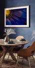Oszałamiająca fotografia makro kwiatu w odcieniach głębokiego błękitu i fioletu z żywym żółtym środkiem. Drobne detale płatków, pyłków i faktur tworzą intymne i artystyczne zbliżenie, które emanuje elegancją i letnim ciepłem.