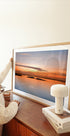 Oszałamiająca fotografia zachodu słońca nad nieruchomą wodą o długim czasie ekspozycji, z jedwabiście gładką powierzchnią świecącą w odcieniach pomarańczy i różu. Stado ptaków w eleganckim locie uzupełnia scenę, dodając ruchu i głębi temu spokojnemu morskiemu pejzażowi. Idealny dla miłośników spokojnych, poetyckich krajobrazów.