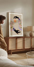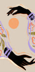 Nowoczesna graficzna ilustracja przedstawiająca dwie czarne dłonie sięgające w stronę świecącego pomarańczowego słońca. Ramiona ozdobione są kwiatowymi rękawami w delikatnych pastelach, tworząc poetycką mieszankę botanicznego piękna i abstrakcyjnego minimalizmu. Praca symbolizuje harmonię, energię i połączenie z naturą.