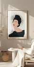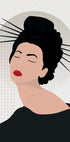 Urzekający portret gejszy o spokojnych, zamkniętych oczach, efektownych czerwonych ustach i eleganckich włosach ozdobionych tradycyjnymi spinkami do włosów. Minimalistyczne tło i wyrafinowany design oddają poczucie piękna i kulturowego wyrafinowania — idealne do wnętrz Japandi, mody i sztuki współczesnej.