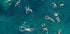 Kolorowy widok z lotu ptaka ludzi pływających i unoszących się w krystalicznie czystej turkusowej wodzie. Ta tętniąca życiem letnia scena oddaje radość wypoczynku, wolności i orzeźwienia pod słońcem. Idealny do przywołania wakacyjnego nastroju i nadmorskiego relaksu.