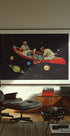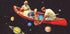 Surrealistyczny kolaż w stylu retro przedstawiający parę w kajaku unoszącą się w kosmosie, w otoczeniu planet i gwiazd. Ten pomysłowy projekt łączy nostalgię z połowy stulecia z kosmiczną fantazją i tworzy zabawną i romantyczną wizję eksploracji kosmosu.