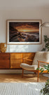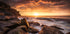 Oszałamiający pejzaż morski na przylądku Solander w Sydney, uchwycony o wschodzie słońca. Złote światło słoneczne przepływa nad horyzontem, oświetlając fale morza i surowe skały ciepłym, świecącym światłem. Jedwabista woda, utworzona w wyniku długiego naświetlania, pięknie kontrastuje z dramatycznym, pełnym chmur niebem i przywołuje zarówno siłę, jak i spokój.