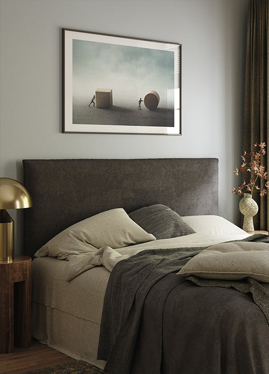 Prowokujące do myślenia, surrealistyczne dzieło sztuki przedstawiające dwie małe postacie popychające różne kształty – sześcian i walec – symbolizujące wysiłek, strategię i innowację. Ten inspirujący obraz przedstawia rozwiązywanie problemów, postęp i wiele dróg do sukcesu. Idealny do nowoczesnych biur, pracowni kreatywnych lub przestrzeni motywacyjnych.