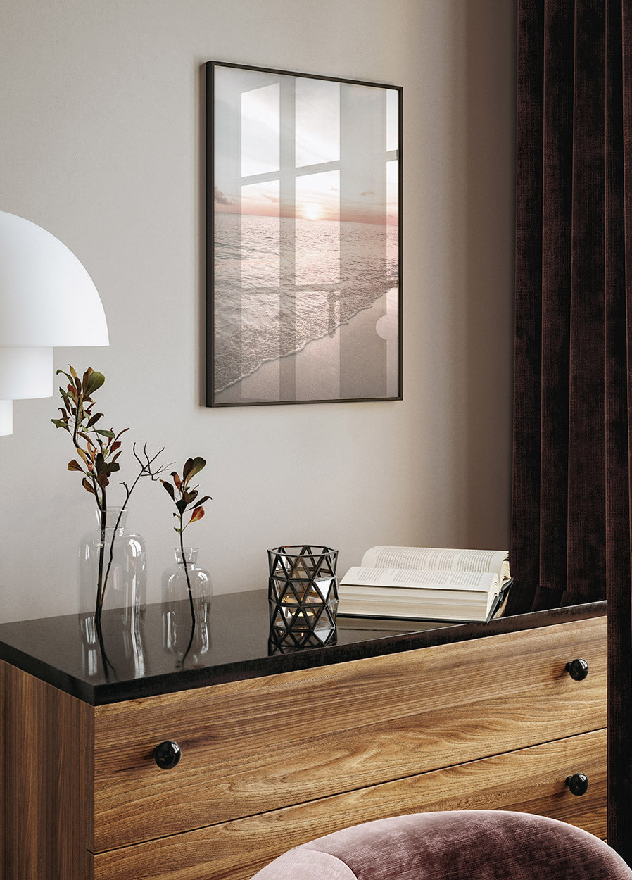 Plakat przedstawiający piękną i spokojną plażę z różowym zachodem słońca, idealny do dodania relaksującej i estetycznej atmosfery do każdego pomieszczenia.