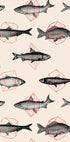 Nowoczesny plakat artystyczny ze szczegółowymi ilustracjami ryb połączonymi z geometrycznymi czerwonymi kształtami. Powtórzenia i symetria tworzą niepowtarzalny wzór, który łączy naturę z abstrakcyjną geometrią, dzięki czemu jest to uderzające dzieło nowoczesnej sztuki ściennej.