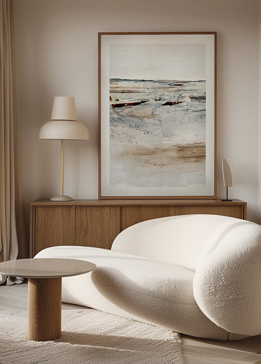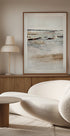 Spokojny abstrakcyjny obraz przybrzeżny autorstwa Dana Hobdaya, z warstwowymi teksturami i miękkimi pociągnięciami pędzla w ziemistych odcieniach beżu, bieli i nutami rdzy. Minimalistyczna, malarska kompozycja przywołuje na myśl nadmorskie horyzonty i łączy nowoczesną abstrakcję z naturalnym spokojem. Idealny element do nowoczesnych wnętrz o nadmorskiej lub minimalistycznej estetyce.