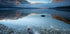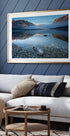 Spokojny plakat krajobrazowy przedstawiający jezioro Bohinj w Słowenii, gdzie nieruchoma woda odzwierciedla góry i mgłę. Czysta linia brzegowa z kamieniami i pniem drzewa podkreśla spokojną i harmonijną atmosferę, idealną do stworzenia ciszy i spokoju w każdej przestrzeni.