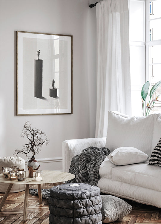 Prowokujące do myślenia surrealistyczne dzieło sztuki przedstawiające dwie małe postacie ludzkie stojące na oddzielnych cylindrycznych cokołach o różnej wysokości. Jedna postać spogląda w dół z wyższej platformy, a druga w górę, ilustrując tematy nierówności, przywilejów i hierarchii społecznej. Minimalistyczny, szara kolorystyka wzmacnia symboliczny przekaz dzieła i czyni je mocnym wizualnym komentarzem na temat statusu, ambicji i perspektywy. Idealna do kolekcji sztuki nowoczesnej, konceptualnej i minimalistycznej.