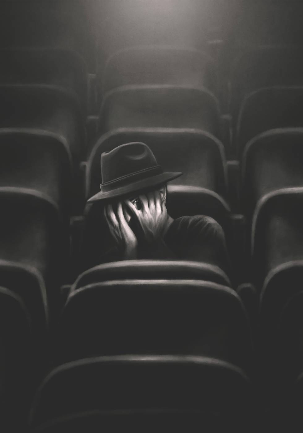 Intensywne, czarno-białe dzieło przedstawiające mężczyznę samotnego w pustej sali kinowej, z głową schowaną w dłoniach i jednym okiem wystającym na zewnątrz. Symbol niepokoju, inwigilacji i egzystencjalnej samotności.