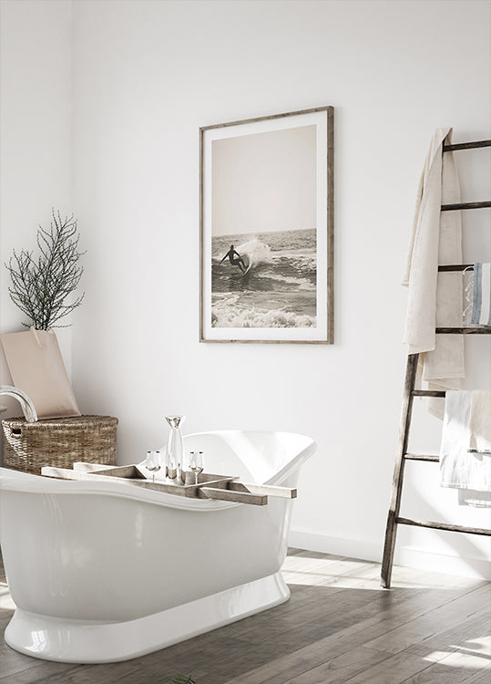 Oszałamiająca fotografia w odcieniu sepii, przedstawiająca surfera przecinającego fale z idealną swobodą. Ruch morza i dynamiczny plusk wody tworzą poczucie przygody i wolności. Idealny dla surferów i wnętrz inspirowanych wybrzeżem.