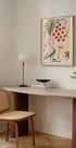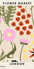 Efektowny plakat inspirowany stylem połowy stulecia z graficznymi kwiatami w kolorze czerwonym, różowym i żółtym na beżowym tle. Reprezentujący tętniące życiem londyńskie targi kwiatowe, łączy w sobie styl retro z botanicznym urokiem.