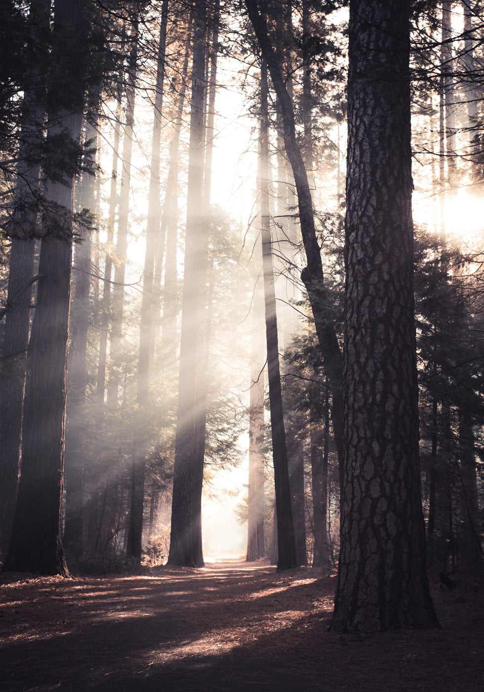 Zapierający dech w piersiach widok na las Doliny Yosemite, z porannym słońcem prześwitującym przez wysokie drzewa, tworzącym spokojną i mistyczną atmosferę. Idealne miejsce dla miłośników natury i osób poszukujących relaksującego wystroju domu.