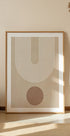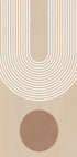 Stylowy, minimalistyczny plakat z czystymi białymi łukami połączonymi z solidnym brązowym kółkiem w delikatnych beżowych odcieniach. Geometryczna kompozycja odzwierciedla nowoczesny design z połowy stulecia i dodaje ciepła, prostoty i elegancji każdemu wnętrzu.