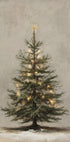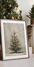Miękko pomalowana choinka w stylu vintage stoi w spokojnym zimowym świetle z małymi złotymi światełkami pomiędzy ciemnozielonymi gałęziami. Neutralne, teksturowane tło i lekka nuta śniegu nadają motywowi spokojną i nostalgiczną atmosferę świąt Bożego Narodzenia – idealnie nadaje się do przytulnych dekoracji sezonowych, klasycznych ścian galerii lub skandynawskich domów.