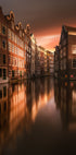 Wieczór amsterdamski Luca Rebustiniego przedstawia spokój zmierzchu nad kanałami miasta. Wąskie domy ze szczytami stoją ramię w ramię, odbijając się w ciemnej wodzie, a ciepłe okna i brukowane uliczki sugerują życie za fasadami. Klimatyczny hołd dla ponadczasowej architektury Amsterdamu. Idealny do wprowadzenia do pokoju wspomnień z podróży i nordyckiej melancholii.