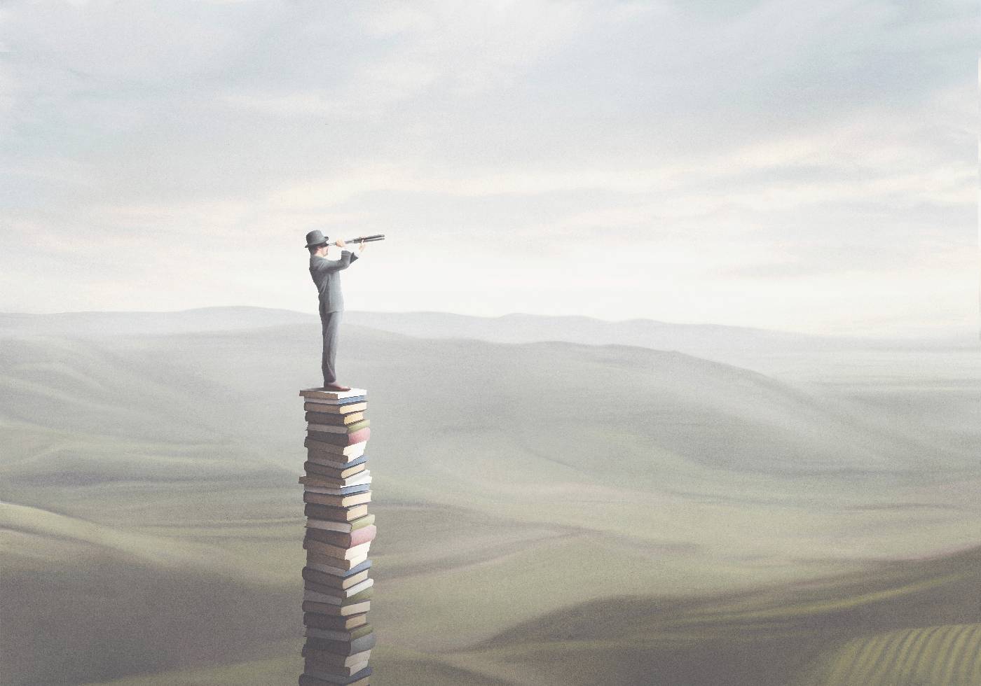 Plakat Wieża Książek* to inspirująca surrealistyczna ilustracja, która symbolizuje wiedzę, naukę i nowe perspektywy. Mężczyzna w garniturze stoi na wysokim stosie książek i patrzy przez lornetkę – piękna metafora tego, jak edukacja i mądrość otwierają horyzonty. Idealny dla bibliotek, biur, sal lekcyjnych lub dla tych, którzy kochają rozwój osobisty i eksplorację intelektualną.