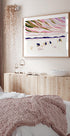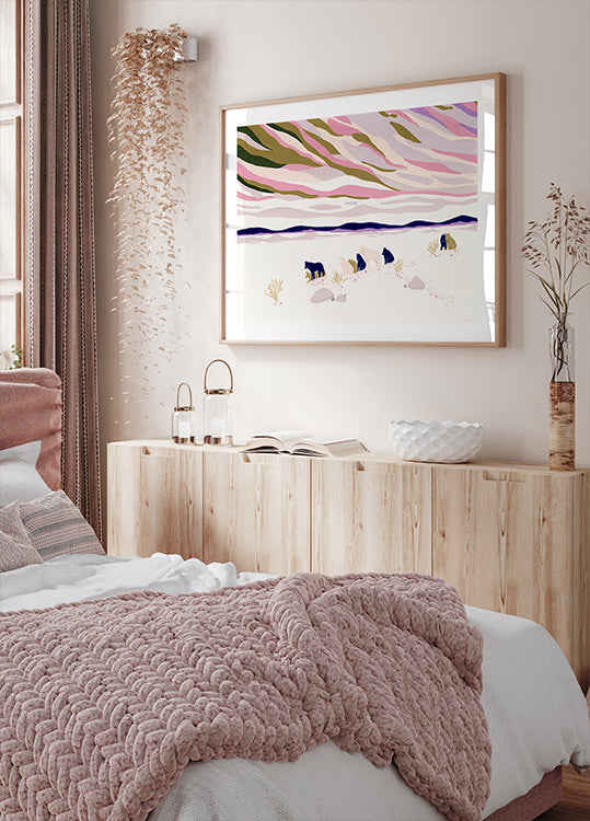 Dramatyczny zimowy krajobraz w stonowanych odcieniach granatu, różu i fioletu, gdzie stado wilków porusza się po śniegu w kierunku odległych szczytów górskich podczas spokojnego zachodu słońca. Ilustracja gwaszowa Julie Lesouef łączy w sobie siłę i poezję, nadając pomieszczeniu poczucie spokoju, dzikości i nordyckiej magii. Klimatyczna grafika ścienna zachęcająca do kontemplacji.
