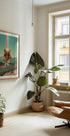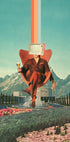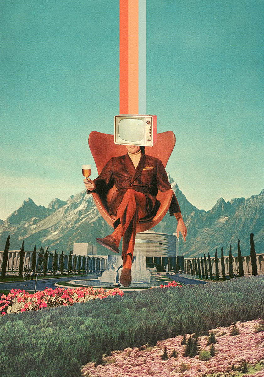 Surrealistyczny cyfrowy kolaż przedstawiający mężczyznę w stroju retro, siedzącego pewnie na pomarańczowym fotelu z kieliszkiem wina w dłoni. Jego głowę zastępuje stary telewizor, który wyświetla kolorowe smugi na niebie. Scena łączy futurystyczną architekturę, górskie krajobrazy i kwiatowe detale, tworząc charakterystyczną mieszankę retro nostalgii i surrealistycznej fantazji.